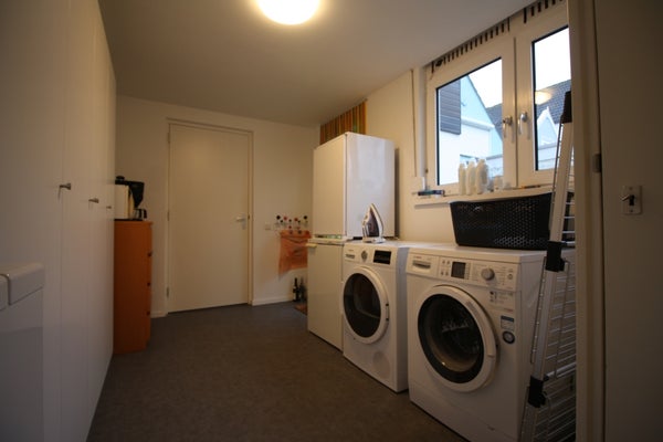 Vanuit de keuken is er toegang tot de kelder (ca. 6m2) en de bijkeuken. In de bijkeuken is plek voor een vriezer, een wasmachine en de droger.