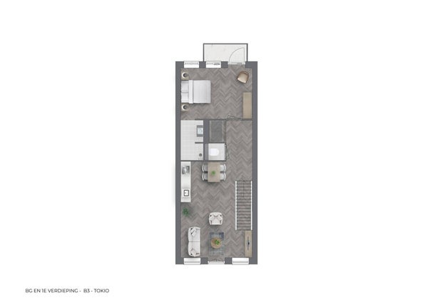 Bij binnentreden van de woning stap je meteen binnen in de woonkamer met grote ramen en veel lichtinval. Via de trap kom je op de eerste etage waar zich de open keuken bevindt, apart toilet, wasmachine ruimte, slaapkamer met badkamer ensuite. Via de slaapkamer kom je op het balkon.