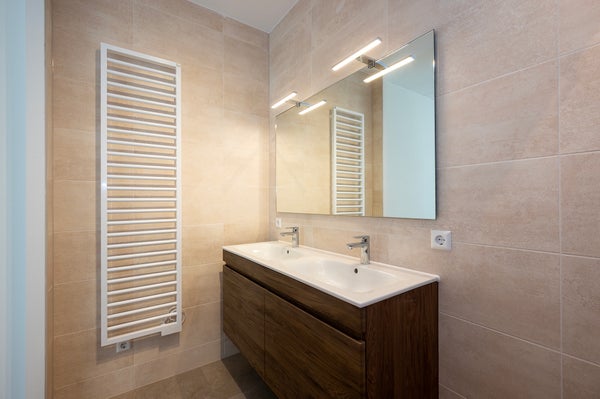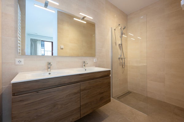 - Moderne badkamer met dubbele wastafel en inloopdouche