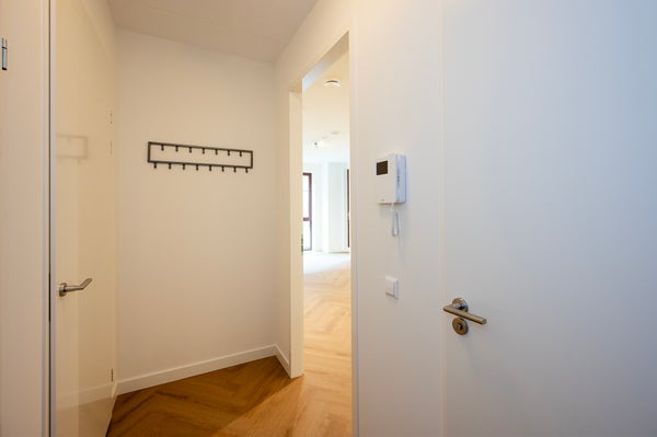 De woonkamer is licht dankzij de grote ramen. Vanuit hier stap je direct het ruime balkon op om even te genieten van de buitenlucht. De open keuken is strak afgewerkt en volledig uitgerust met inbouwapparatuur: vaatwasser, combi-oven, inductiekookplaat, koelkast en voldoende kastruimte.