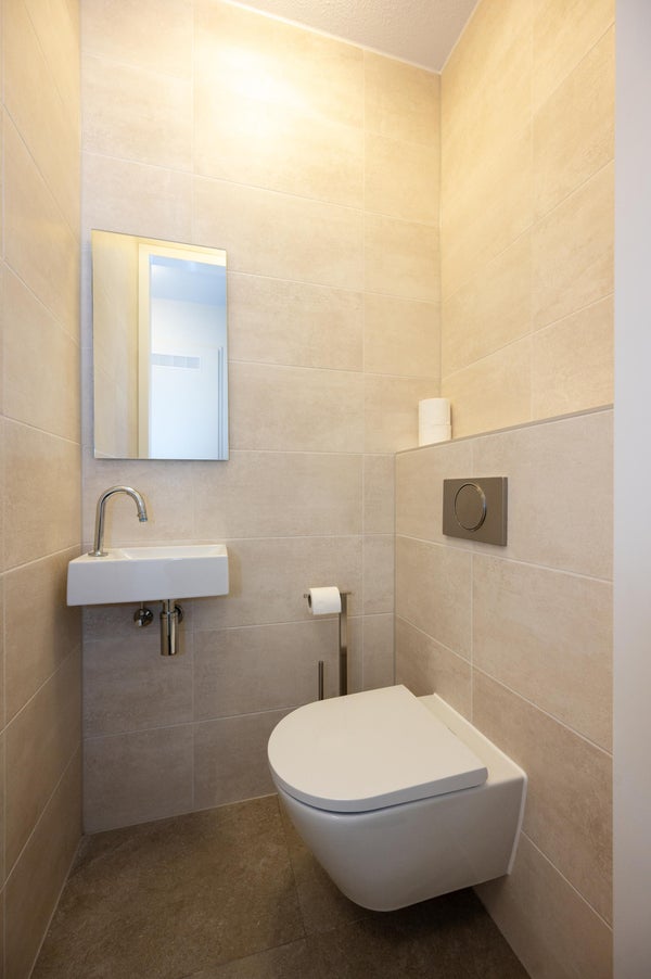 Via de entree kom je in de gang die toegang biedt tot alle vertrekken. Hier vind je een separaat toilet met wastafel en spiegel, en een ruime inpandige berging met aansluiting voor wasmachine en droger.