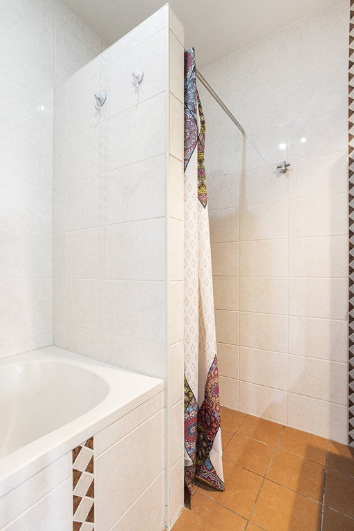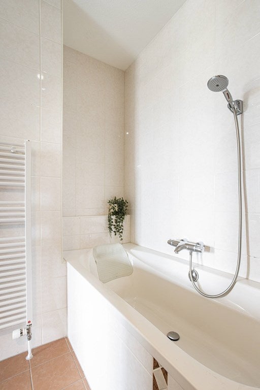 De badkamer heeft een douche, wastafel met spiegel en kasten en een badkuip.