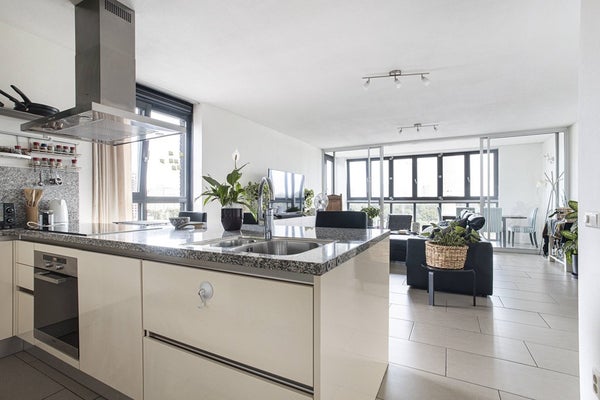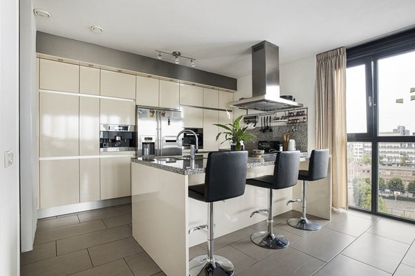 Wanneer je het appartement binnenkomt, kun je vanuit de gang alle kamers bereiken. Er is een lichte en ruime woonkamer (met serre) met een uitstekend uitzicht op de Maas en de Euromast! De keuken met kookeiland is uitgerust met een vaatwasser, een Amerikaans koelkast, oven, inductiekookplaat, afzuigkap en koffiezetapparaat.