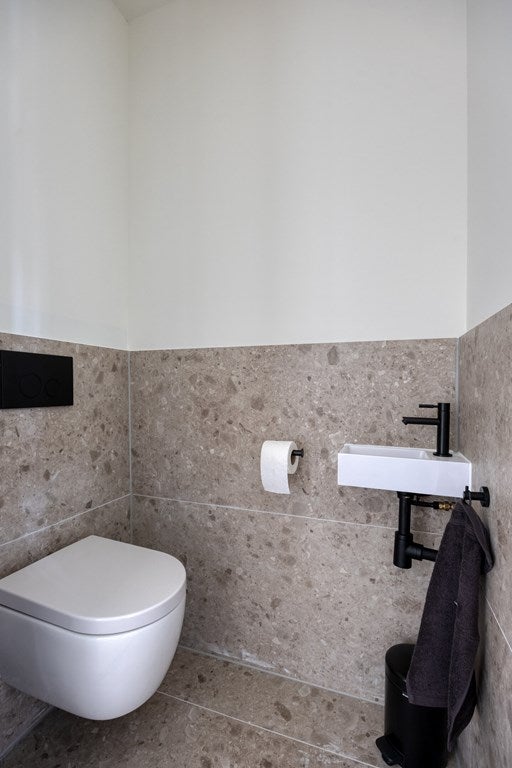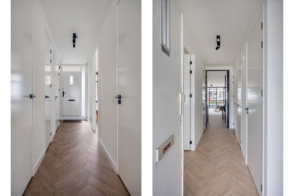 U komt binnen via een ruime hal met toegang tot het ruime en gloednieuwe toilet met wastafel, de meterkast en een praktische bergkast.