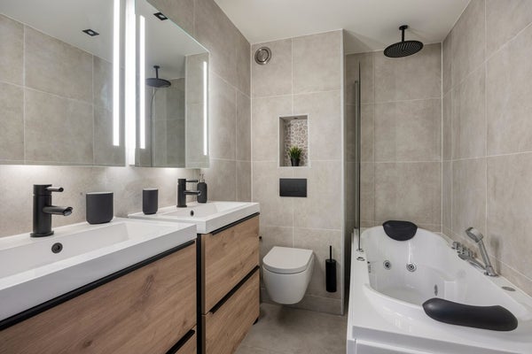 De onlangs gerenoveerde badkamer beschikt over een badkamer met regendouche, toilet en dubbele wastafel met dubbele LED-lampen spiegel.
