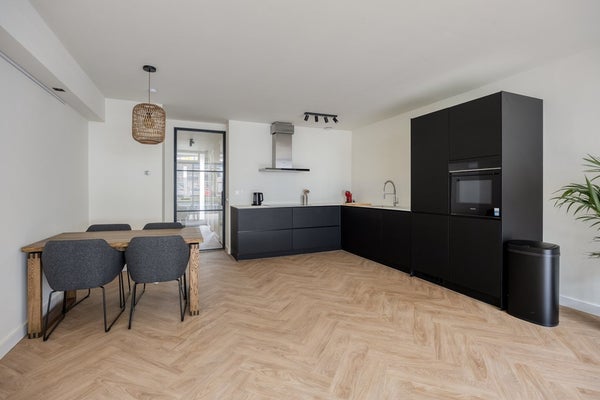 De prachtige lichtovergoten woonkamer is uitgerust met grote ramen die veel natuurlijk licht binnenlaten. De ruimte voelt open en uitnodigend aan, met ruimte voor zowel een comfortabele zithoek als een eetkamer. De grote open keuken is slechts ter impressie te zien op de foto's. De werkelijke keuken is een soortgelijke, ruime zwarte open keuken zonder een aparte keukenunit, met moderne apparatuur, inclusief een inductiekookplaat met afzuigkap, oven, koelkast met vriezer en vaatwasser. Perfect voor koken of vermaken.