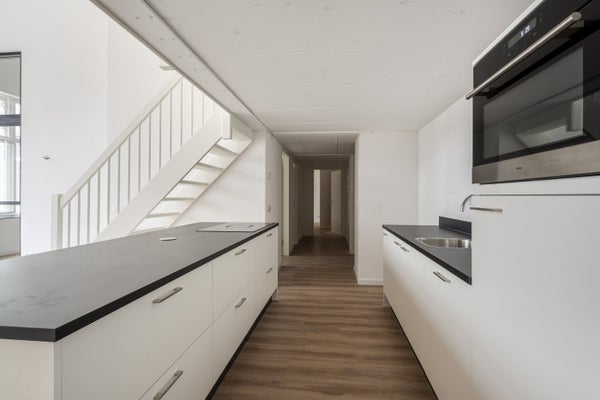The Type F2 Maisonnette is a split level apartment with entresol in a monumental building. The apartment has an atrium view. This spacious apartment features two bedrooms on the entresol, a spacious living room and a bathroom with walk-in shower. The kitchen includes a large cooking island with lots of storage space, combi oven/microwave, fridge freezer combination, dishwasher and induction cooker. The apartment also has a separate room with a washing machine connection. Next to the living area, it has a great and large space to create an office, atelier or workspace. Don’t want to receive your clients in your own house? No worries, the atelier also consists a small kitchen, a separate front door and two separate toilets!