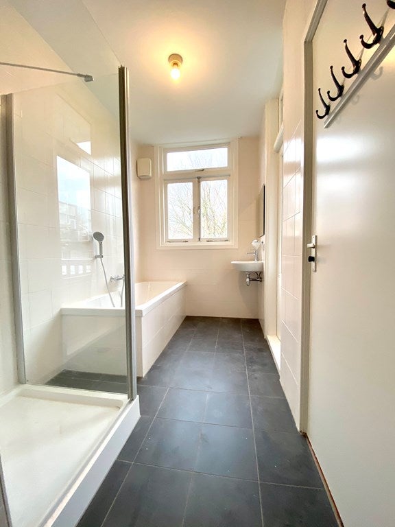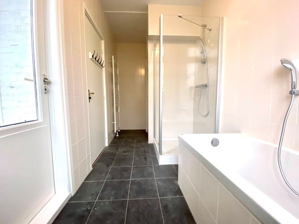 De ruime badkamer is voorzien van een wastafel met spiegel, handdoekradiator, ligbad en en separate douche. In een kast zit de wasmachine-aansluiting.