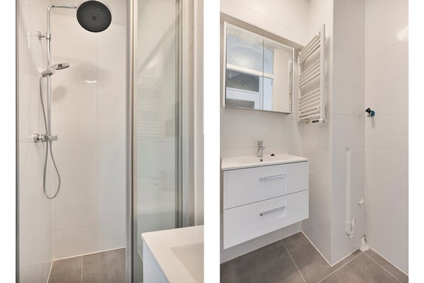 De badkamer is netjes; er is een douche en wastafel met spiegel en kasten. Hier bevindt zich ook de aansluiting voor de wasmachine.
