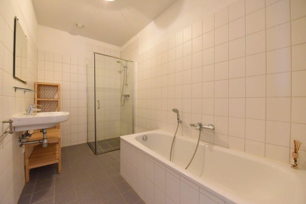 De badkamer is voorzien van een ligbad, douche en wastafel.