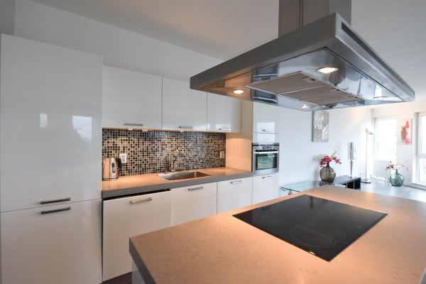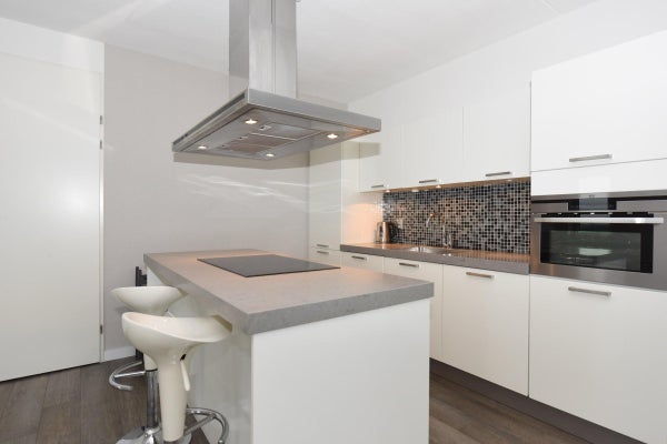 De open keuken is voorzien van een kookeiland met afzuigkap, oven, vaatwasser en koel/vriescombinatie.