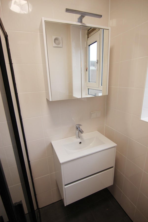 • De compleet vernieuwde badkamer ligt aan de achterzijde en is uitgerust met een douchecabine, wastafelmeubel, spiegelkast en handdoekenradiator.