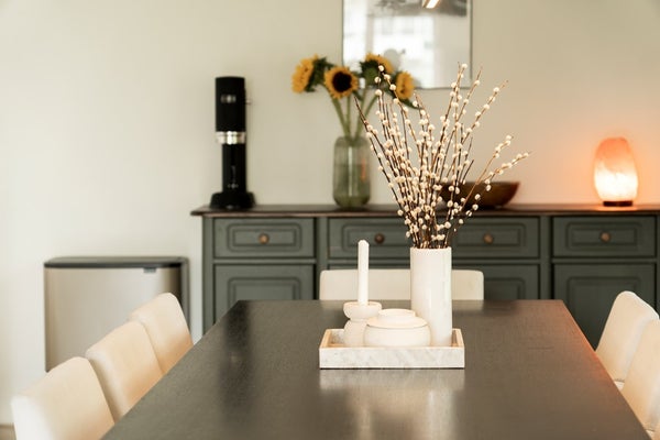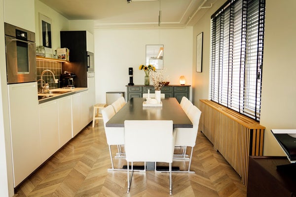 Aan de achterzijde is de moderne keuken volledig uitgerust met inbouwapparatuur, waaronder een Quooker, inductiekookplaat, vaatwasser, oven en wijnkoeler. De keuken biedt ook toegang tot een tweede balkon, een rustige plek om aan het eind van de dag tot rust te komen. Dit balkon biedt de mogelijkheid om te dineren met vrienden en familie omgeven door planten.