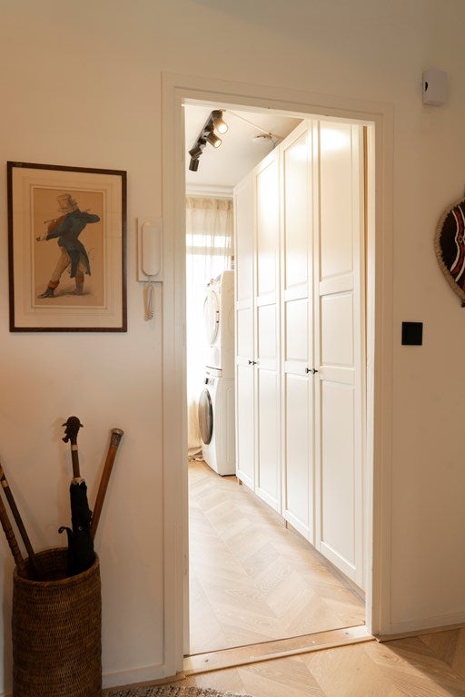 De tweede slaapkamer is momenteel ingericht als praktische kleed- en opbergruimte, met royale kasten en veel kasten om alles netjes georganiseerd te houden. Hier vind je ook de wasmachine.