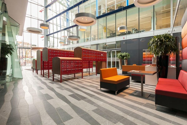 Receptie en servicebalie, video bellenplateau, brievenbussen en toegang tot de liftinstallatie.