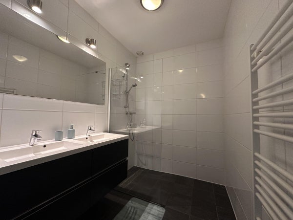 De badkamer is voorzien van een inloopdouche met thermostaatkraan en glazen wand, dubbele wastafel met meubel, spiegel en verlichting en een designradiator.