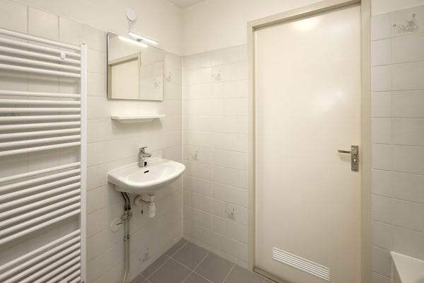 Tegenover de keuken ligt een ruime slaapkamer die gemakkelijk plaats biedt aan een kingsize bed, een grote kledingkast en een bureau. Aangrenzend aan deze slaapkamer bevindt zich de moderne badkamer, voorzien van een douche in bad, een wastafel met spiegel en een handdoekradiator.