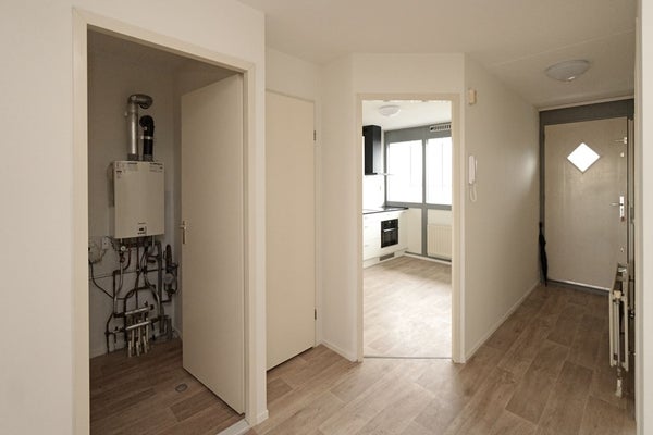 Bij binnenkomst in de woning betreed je een ruime hal met een belintercom, die toegang biedt tot alle vertrekken. In de hal bevindt zich een separaat toilet en een handige berging met aansluiting voor een eigen wasmachine en droger.
