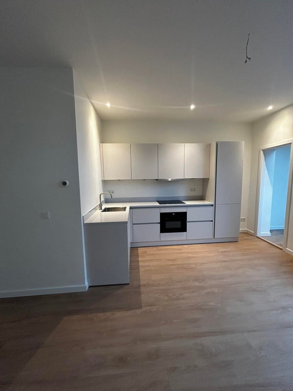 Lichte woonkamer, open keuken en toegang tot het balkon.