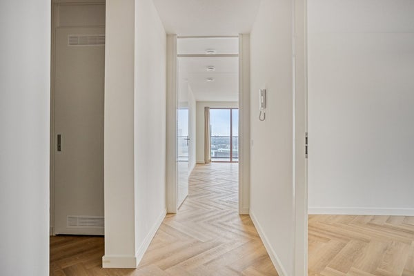 17e verdieping: Entree in een lichte hal die naar alle kamers leidt. De open woonkamer en eetkamer bieden een comfortabele setting met grote ramen voor veel natuurlijk daglicht. De gloednieuwe keuken is volledig uitgerust met inbouwapparatuur waaronder een combi-oven, inductiekookplaat, koelkast, vriezer en vaatwasser, perfect voor degenen die graag thuis koken.
