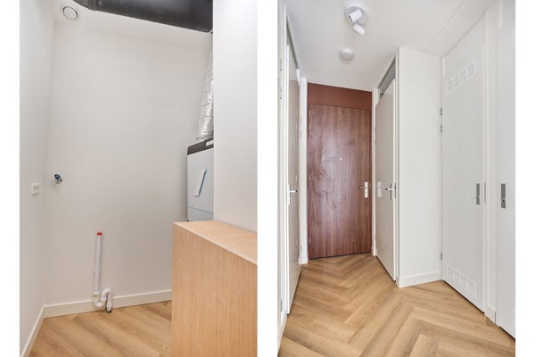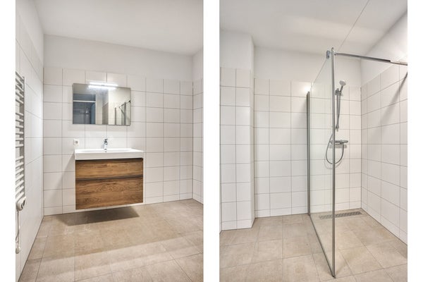 De badkamer is voorzien van een moderne inloopdouche en een wastafel met spiegel. Daarnaast beschikt het appartement over een aparte interne bergruimte met aansluiting voor een wasmachine. Het moderne toilet met wastafel is ook toegankelijk vanuit de hal.