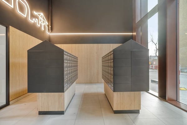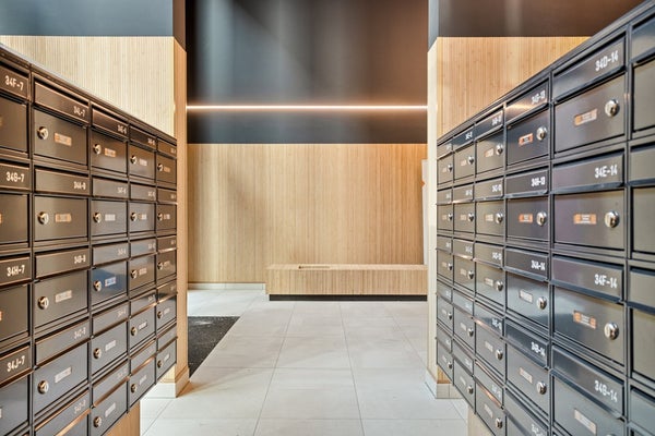 Begane grond: Veilige ingang met brievenbussen, liften, trap en toegang tot een gedeelde fietsenberging.