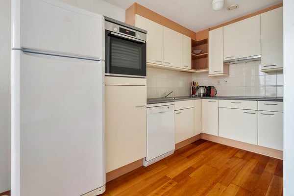 Lichte en ruime woonkamer met grote raampartijen van vloer tot aan het plafond en open keuken voorzien van koelkast, vriezer, elektrische kookplaat en magnetron/oven.