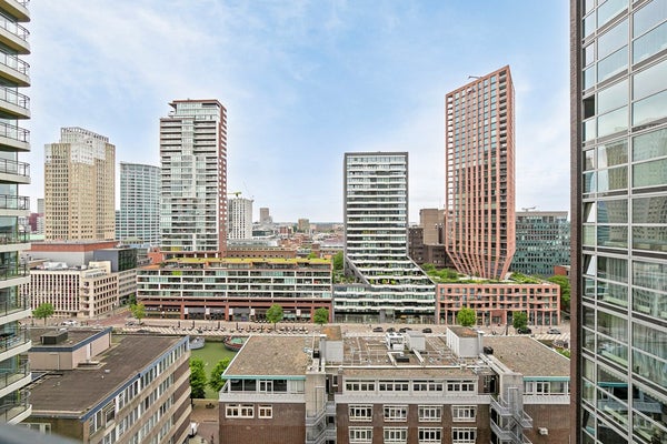Fantastisch uitzicht op en vanuit het bruisende centrum van Rotterdam. Gemeubileerd drie-kamer appartement op de 15e etage in de Waterstadtoren. Alle dagelijkse voorzieningen binnen handbereik met de Coolsingel en de Koopgoot om de hoek .