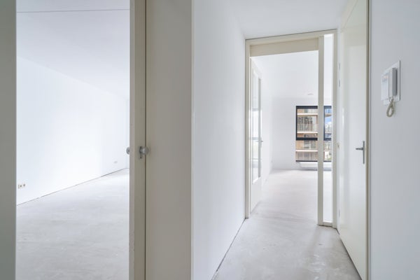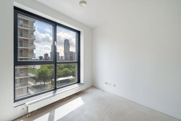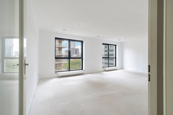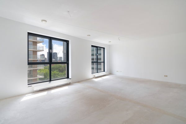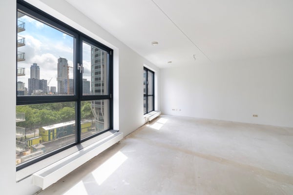Entree/hal, meterkast, inpandige berging met wasmachine aansluiting, separaat toilet met fontein. Zeer ruime en lichte woonkamer met geweldig uitzicht over het stadscentrum van Rotterdam (zuid georiënteerd).