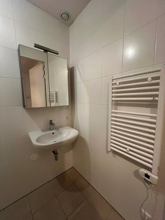 De badkamer is ingericht met een douche, handdoekradiator en wastafel met spiegel.