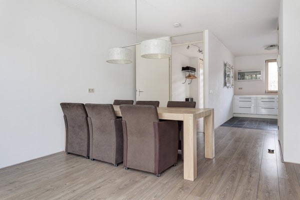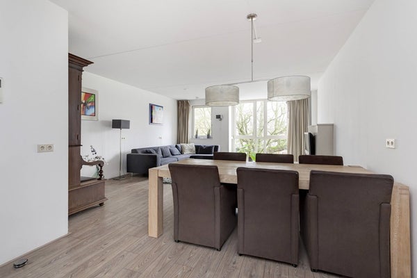 De woonkamer heeft een grote bank, een grote eettafel en meerdere kasten. Vanuit de woonkamer is er toegang tot de ruime keuken.