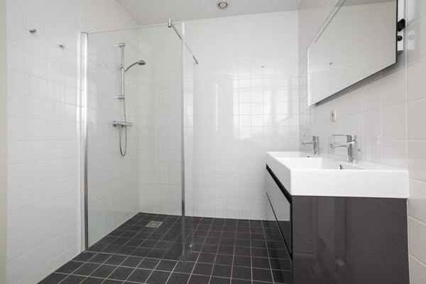 De moderne badkamer heeft een wastafel met inloopdouche en er is een apart toilet aanwezig.