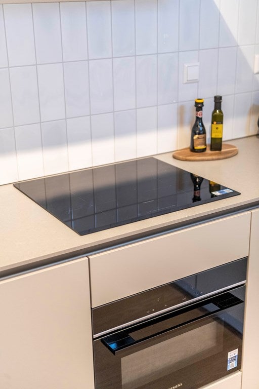 4e verdieping: Je komt het appartement binnen in de hal die toegang geeft tot alle kamers. De woonkamer is een mooie en lichte ruimte en heeft een gloednieuwe open keuken. Deze zeer moderne keuken is uitgerust met apparaten zoals een combi-oven, inductiekookplaat met afzuigkap, vaatwasser, koelkast/ diepvriezer en een gootsteen.