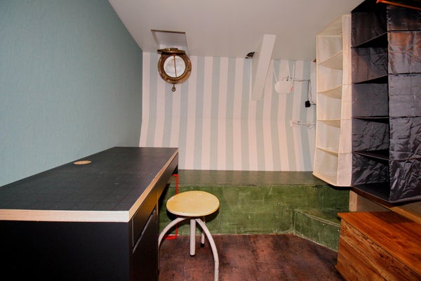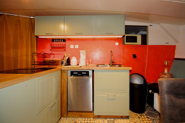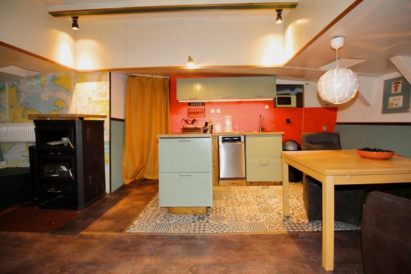 Op het schip bevinden zich in totaal drie woningen, en dit appartement beschikt over een eigen ingang. Bewoners delen het schip op een gemoedelijke manier – je bent vrij om overal te lopen, maar het is belangrijk dat iedereen het goed met elkaar kan vinden.