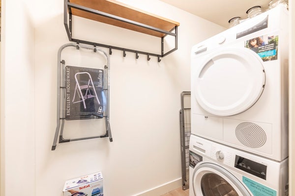De badkamer is modern en ruim, uitgerust met een inloop regendouche, wastafel met spiegel en handdoekradiator. De toiletruimte is apart en bevat een klein wastafeltje. Een privé opslagruimte met een wasmachine/droger combinatie is toegankelijk vanuit de gang.