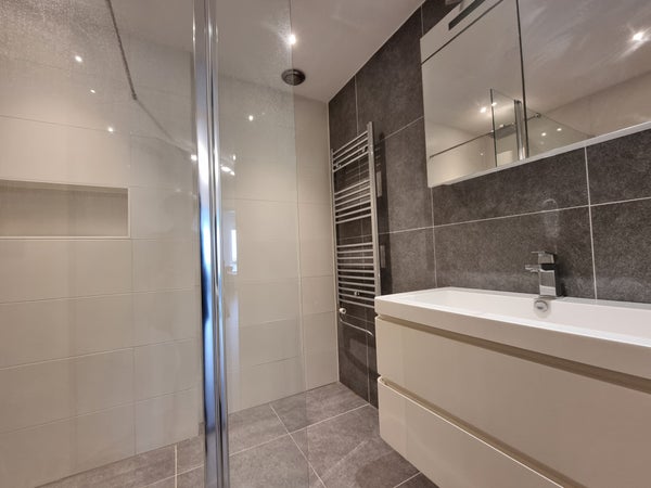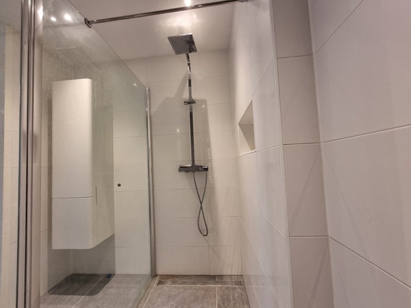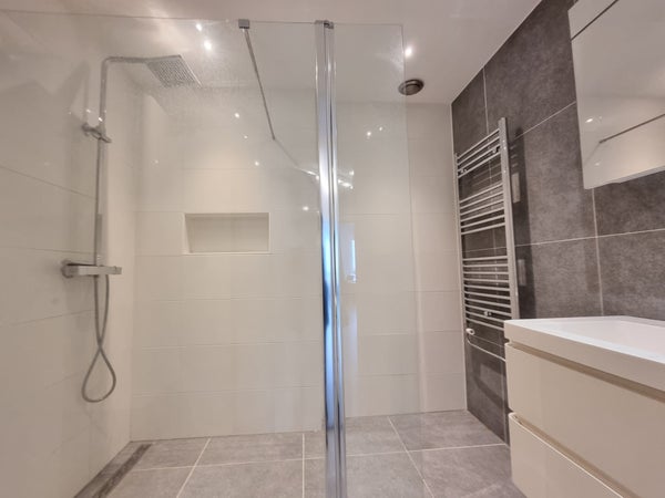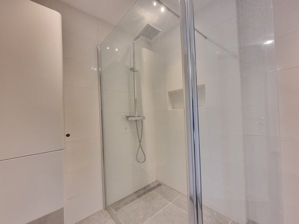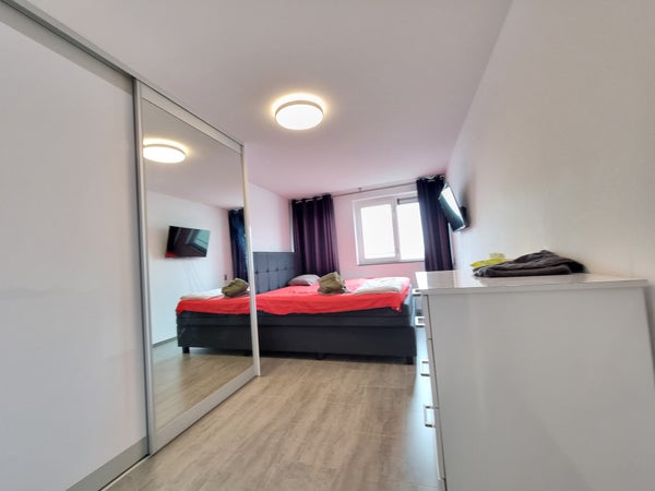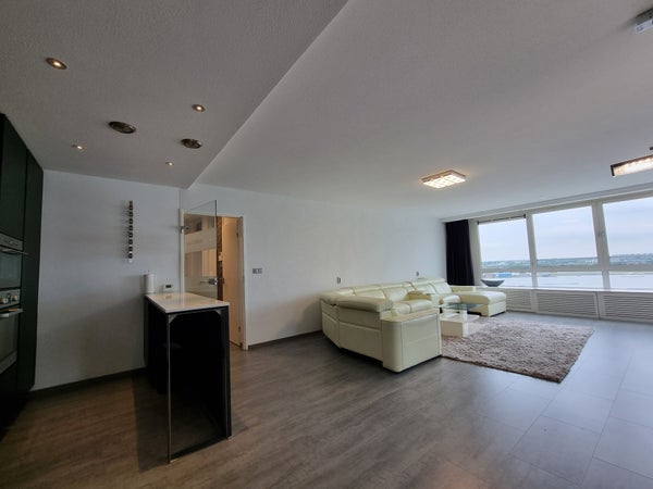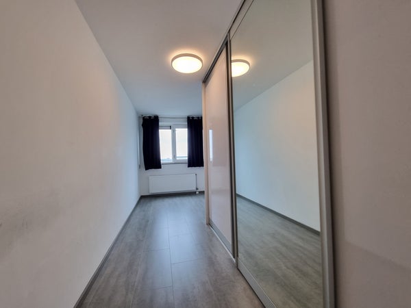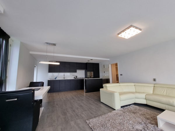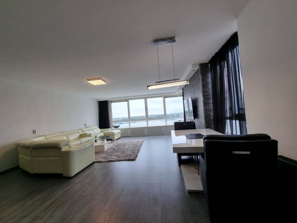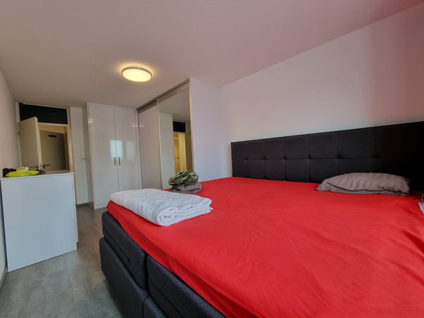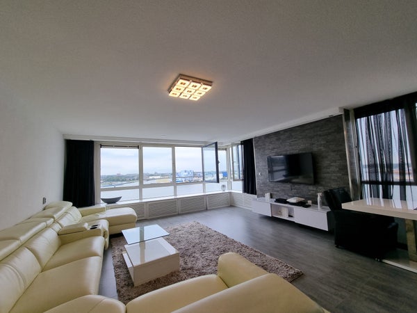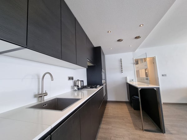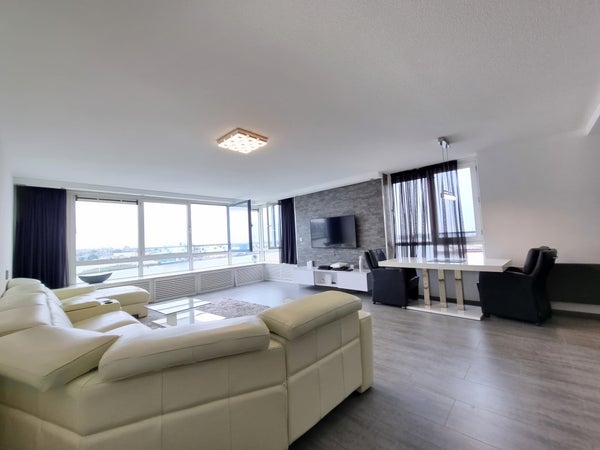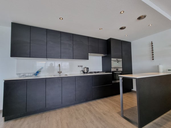 Indeling 10e verdieping Dit moderne appartement beschikt over drie kamers, met een ruime woonkamer, een open keuken, en twee slaapkamers. De woonkamer is ruim en uitnodigend, ingericht met een grote, comfortabele crèmekleurige bank. De open keuken sluit naadloos aan op de woonkamer en is voorzien van strakke, zwarte kastjes die een luxe uitstraling geven. De keuken is uitgerust met een ingebouwde oven, magnetron, vaatwasser, koelkast, wasbak, en gasfornuis. Er is ook een bar. Slaapkamer 1 is voorzien van een groot tweepersoonsbed, een grote kledingkast met veel opbergruimte, en een dressoir voor extra opbergruimte. Slaapkamer 2 beschikt over een grote kledingkast, ideaal voor extra opbergruimte, waardoor het ook geschikt is als logeerkamer of studeerkamer.