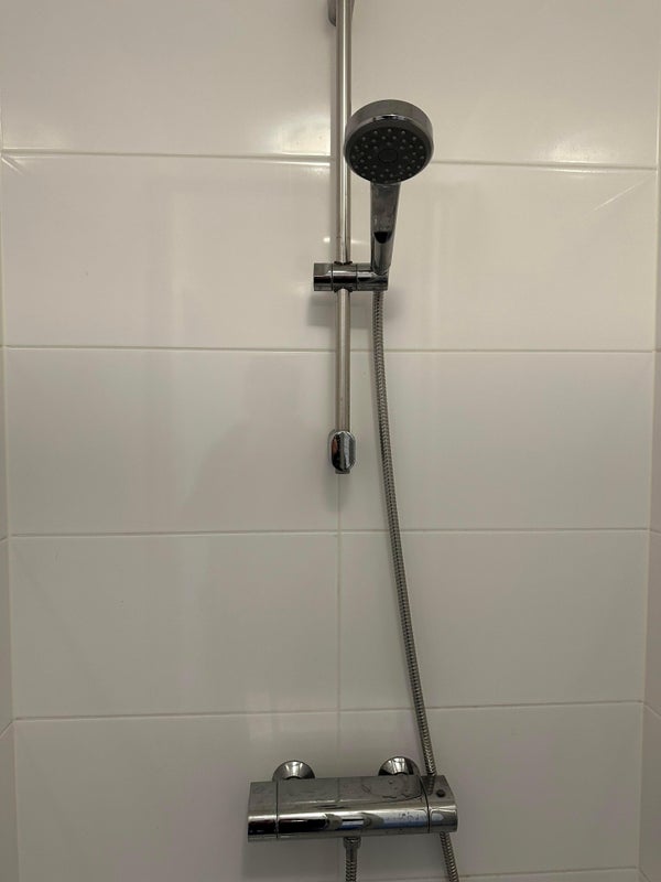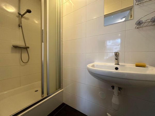 Aangrenzend aan de woonkamer bevindt zich het slaapgedeelte met een tweepersoonsbed en een linnenkast. De badkamer, uitgevoerd in lichte kleuren, is voorzien van een douche, wastafel en spiegel. Het toilet wordt gedeeld met één medebewoner.