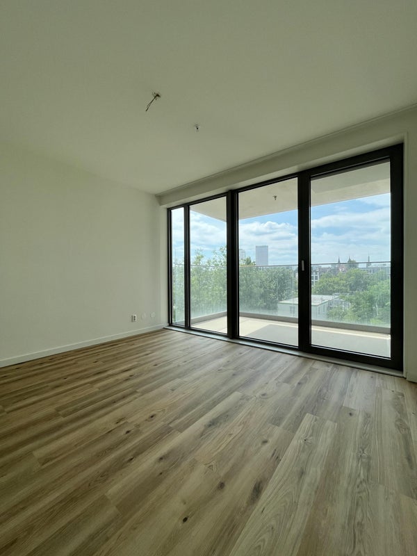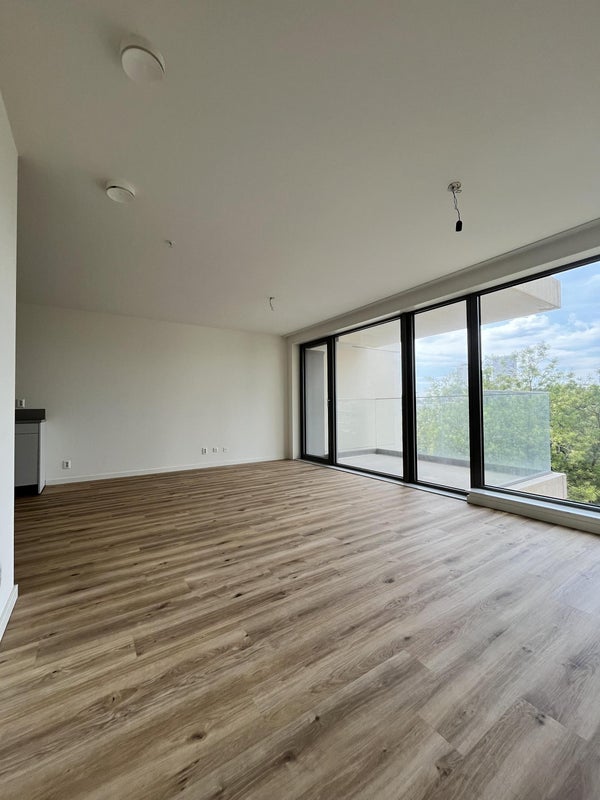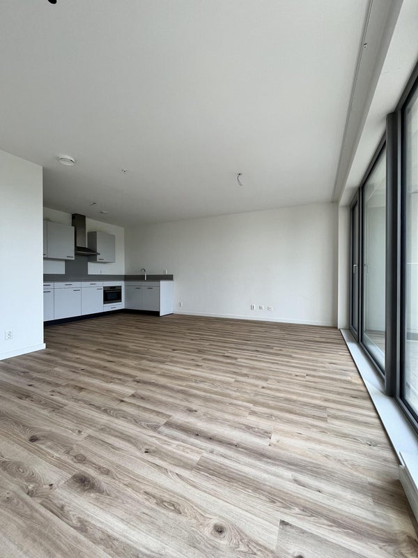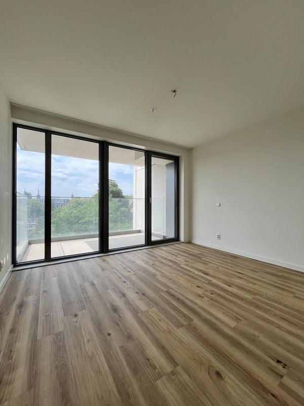 De lichte woonkamer met open keuken geeft toegang tot het west-gerichte balkon, een perfecte plek om te ontspannen.