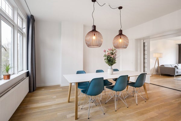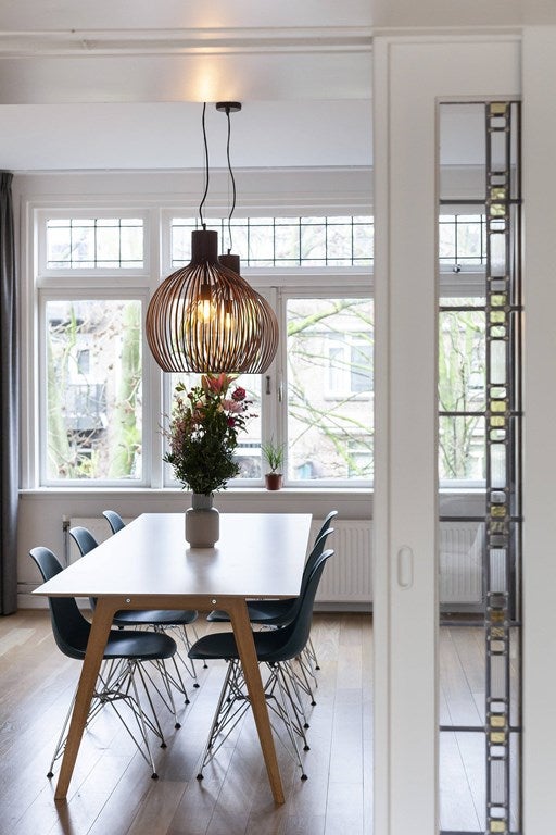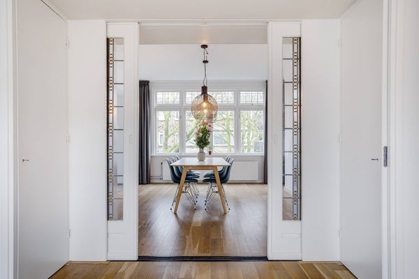 Fantastische woon- en eetkamer met sfeervolle details zoals een mooie houten vloer en originele en-suite deuren met glas-in-lood ramen. Op deze etage zijn er fijne inbouwkasten die zorgen voor extra opbergruimte.
