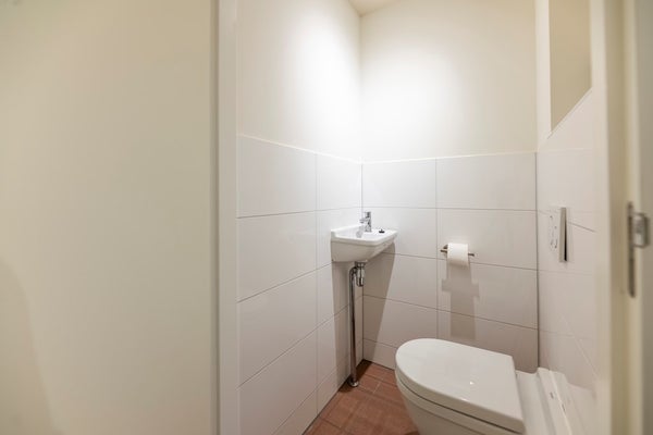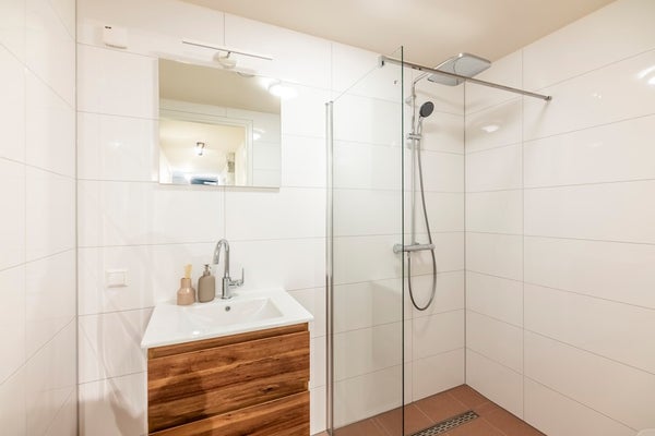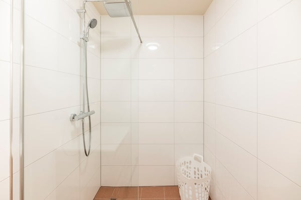 De badkamer is modern en ruim, voorzien van een inloopdouche met regendouche, wastafel met spiegel en handdoekradiator. Het toilet is apart en heeft een kleine wastafel. Een privé-opslagruimte met een wasmachine/droger combinatie is toegankelijk vanuit de gang.