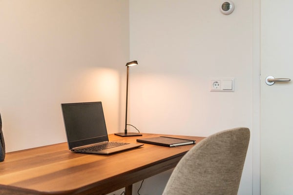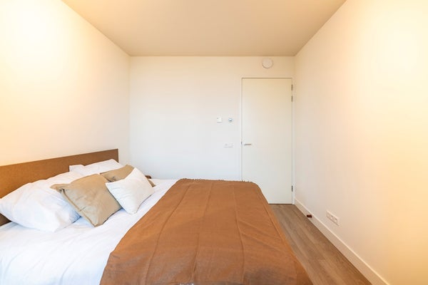De master slaapkamer heeft een eigentijdse uitstraling en is ingericht met een tweepersoonsbed, nachttafels en een kast. De tweede slaapkamer is iets kleiner en is ingericht als een flexibele ruimte met een bureau en een slaapbank, ideaal als thuiskantoor, gastenkamer of hobbykamer.