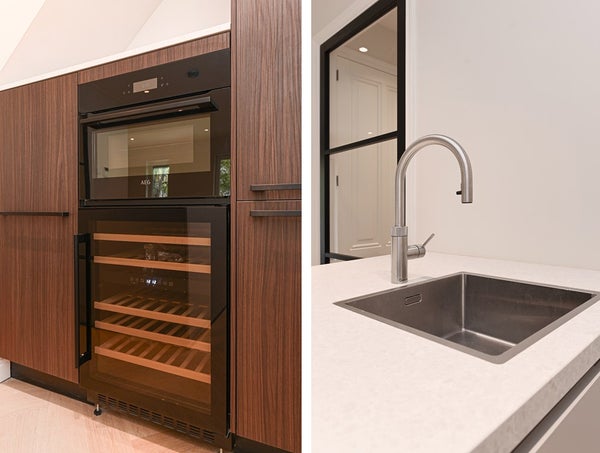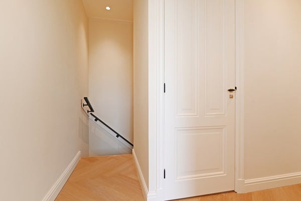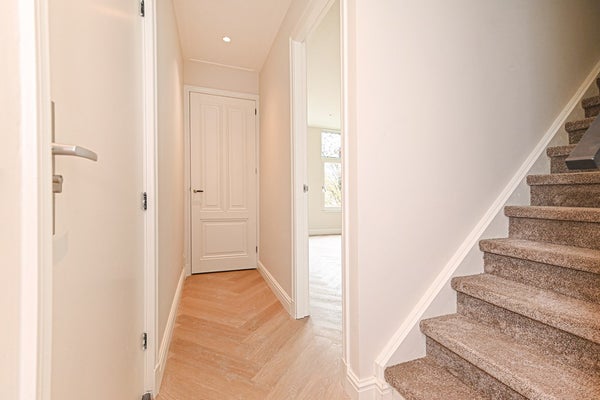 Opgang naar eerste verdieping. Entree woning in de hal. Op de eerste etage bevindt zich de woonkamer met openkeuken voorzien van alle denkbare moderne inbouwapparatuur, koelkast, vriezer, vaatwasser, inductiekookplaat, kokend water kraan van Quooker en een wijnkoeler. Via de woonkamer toegang tot het achterbalkon. Verder bevindt de master bedroom met eigen badkamer voorzien van inloopdouche met dubbele wastafel en spiegel zich aan de voorzijde van het appartement. In de hal separaat het toilet met fontein.