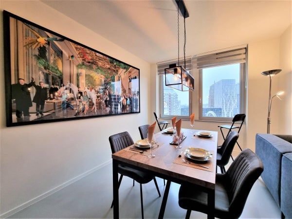 Schitterend gelegen en ruim opgezet gemeubileerd 3-kamer appartement (2 slaapkamers) met sfeervol uitzicht over de binnenstad. Appartement is volledig gerenoveerd. . Luxe en modern wonen in combinatie met een fantastisch uitzicht op de stad maken het appartement compleet. Dit bijzonder fraaie appartement is gelegen op de 9e verdieping van het complex "Statendam". De Markthal, station Blaak en de Koopgoot zijn op loopafstand te bereiken!