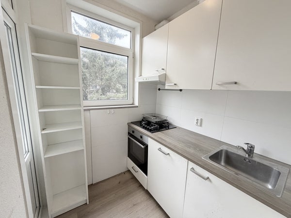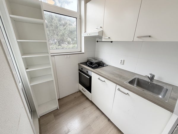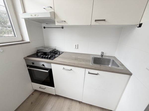 Entree op de 1e etage met toegang tot de hal. Vanuit de hal is er toegang tot de woonkamer en de dichte keuken. De gehele woning is voorzien van een laminaatvloer. De keuken is uitgevoerd als gesloten keuken en beschikt over een gasfornuis, spoelbak en oven.