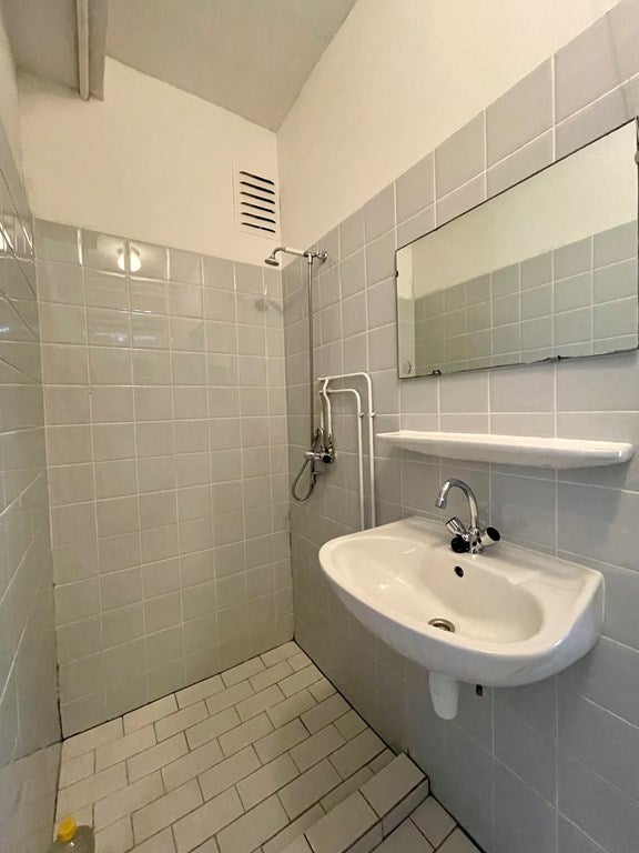 Via deze slaapkamer is de betegelde badkamer met inloopdouche en wasmeubel met spiegel te bereiken.