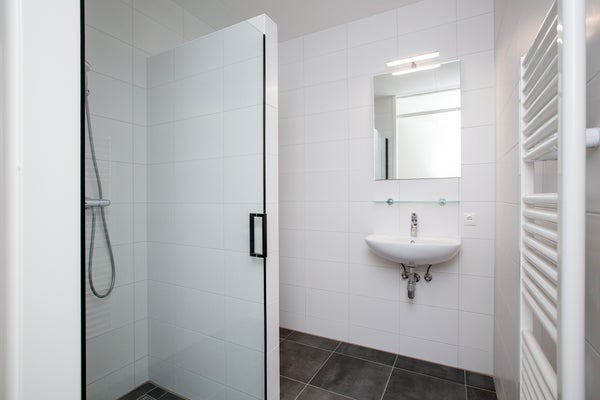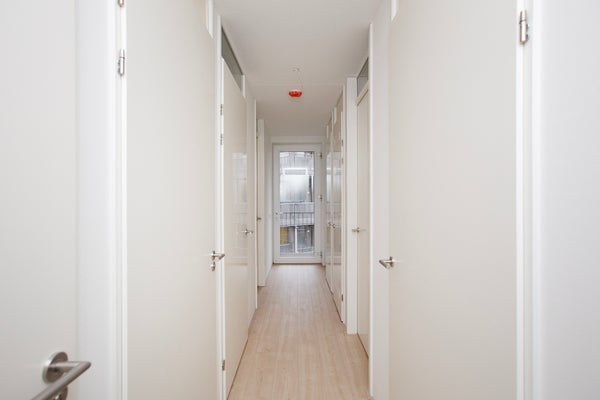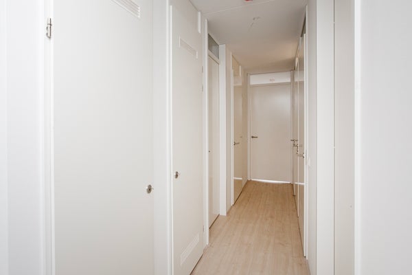 Via de hal heeft u toegang tot vrijwel alle vertrekken van de woning, waaronder de woonkamer met open keuken, twee slaapkamers, de badkamer, het toilet, de berging, en de meterkast. De woning beschikt over twee slaapkamers, waarvan één slaapkamer ruimer is opgezet en de andere wat compacter, ideaal als logeer-, werk- of kinderkamer. Via de hal bereikt u de lichte en ruime woonkamer met open keuken. De woonkamer biedt voldoende ruimte voor zowel een comfortabele zithoek als een eethoek en wordt gekenmerkt door veel natuurlijke lichtinval. De moderne open keuken is voorzien van diverse inbouwapparatuur, waaronder een koelkast, vriezer, inductiekookplaat, combi oven-magnetron, vaatwasser, en een spoelbak. Daarnaast beschikt de keuken over voldoende kastruimte, waardoor u beschikt over volop opbergmogelijkheden. Vanuit de woonkamer heeft u toegang tot het balkon, waar u kunt genieten van een vrij uitzicht en een prettig buitengevoel. De volledige woning is voorzien van een nette laminaat vloer. Beide slaapkamers zijn aangenaam licht dankzij de royale raampartijen, wat bijdraagt aan een frisse en open uitstraling. De volledig betegelde badkamer is praktisch en stijlvol ingericht en beschikt over een inloopdouche, een wastafel en een handdoekenradiator. Het separate toilet is modern afgewerkt en voorzien van een hangend toilet en een fonteintje.