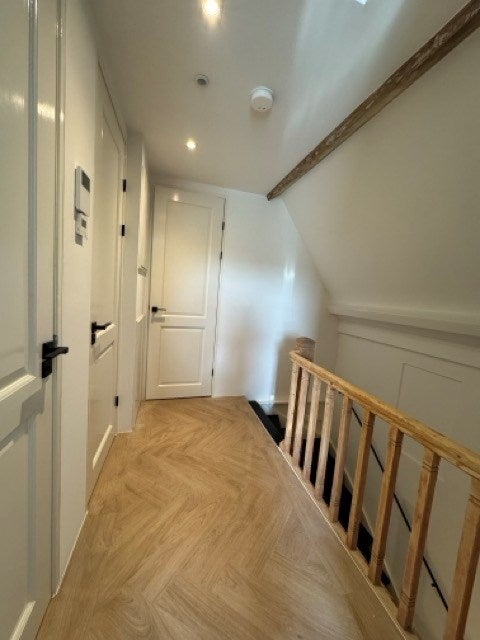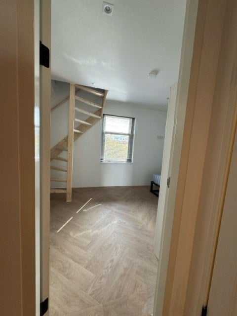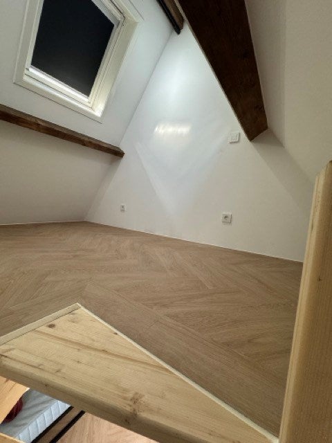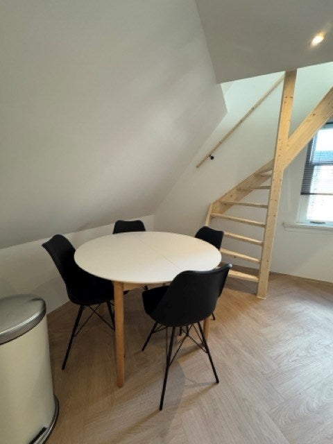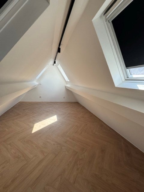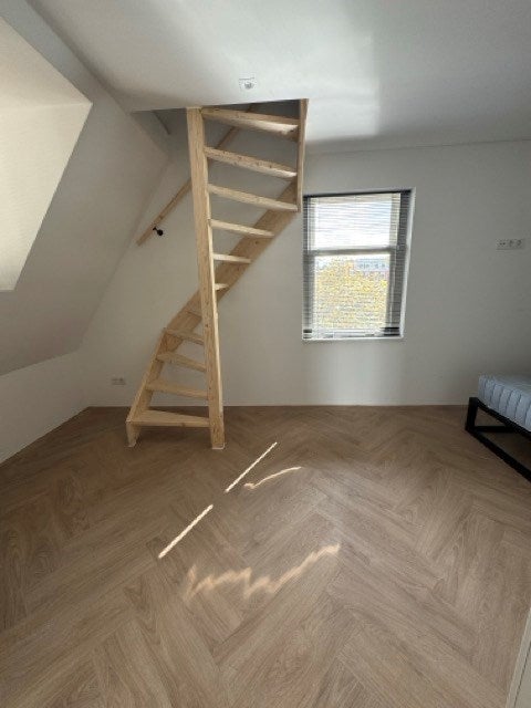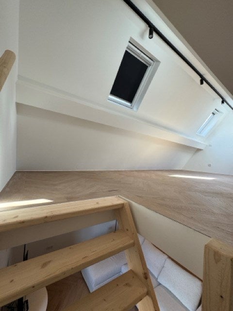 Indeling van het appartement: Op de tweede verdieping van deze woning leidt de deur rechts je naar een recent gerenoveerde keuken en een ruime woonkamer. In de woonkamer vind je een trap naar een loft die kan worden gebruikt als atelier of werkplek — ideaal om in alle rust te werken of creatief bezig te zijn. Tegenover de woonkamer bevindt zich de slaapkamer, met grote ramen die de ruimte vullen met natuurlijk licht. Vanuit de slaapkamer leidt een tweede trap naar een extra loftruimte, geschikt voor opslag, ontspanning of een gezellig leeshoekje.