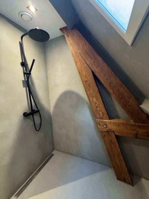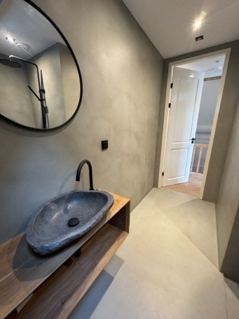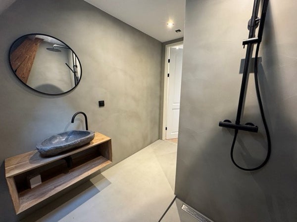 Naast de slaapkamerdeur bevindt zich de badkamer. Deze badkamer is voorzien van een inloopdouche, toilet en wastafel. De combinatie van zwarte kranen en een betonnen vloer geeft de ruimte een moderne en luxe uitstraling.