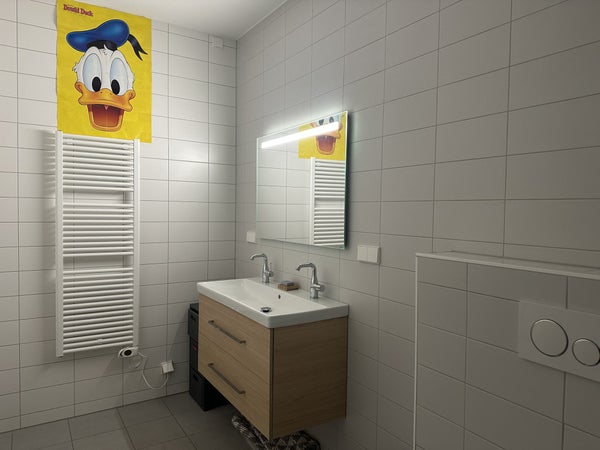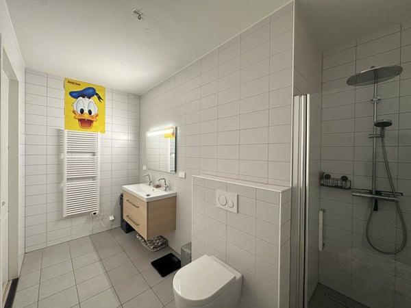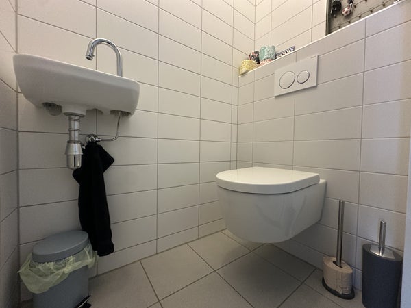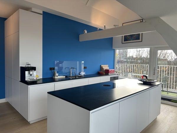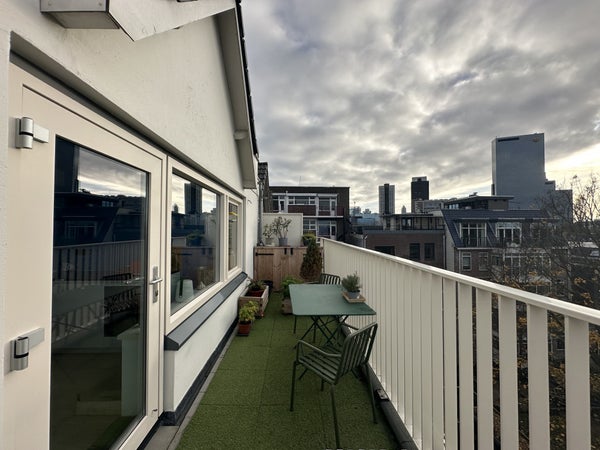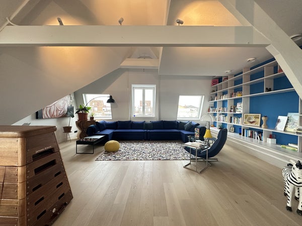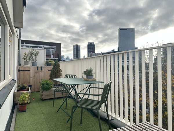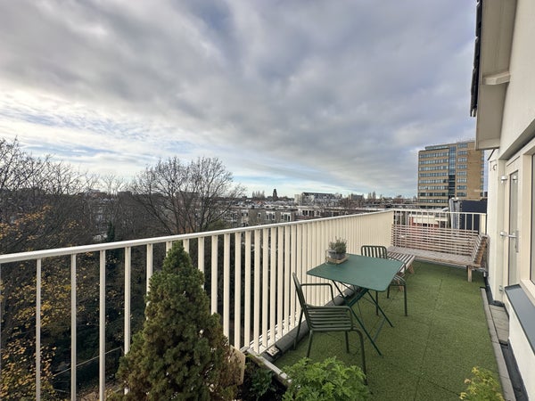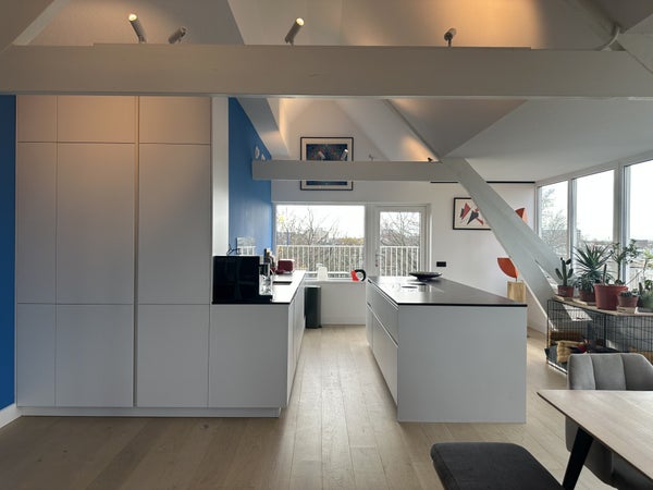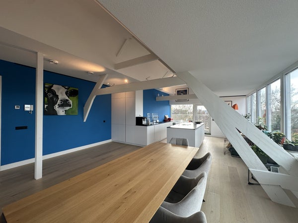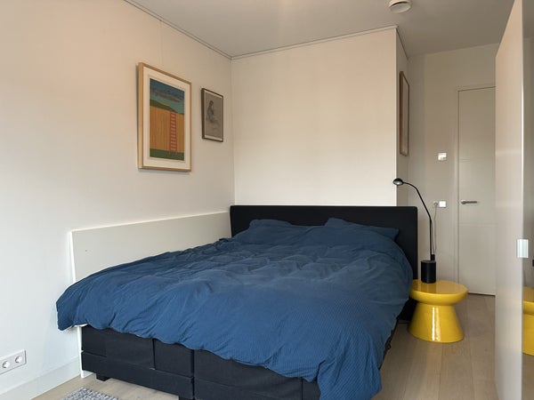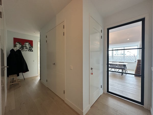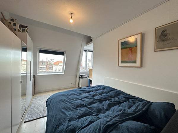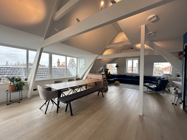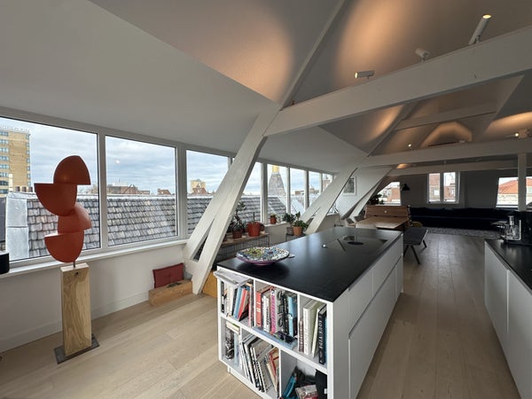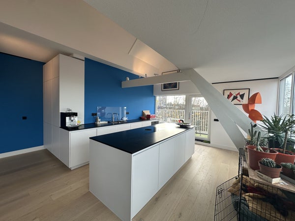 Indeling Je komt binnen in de hal die toegang geeft tot alle vertrekken. Vanuit hier loop je door naar de ruime leefruimte die meteen indruk maakt door het hoge plafond met witte balkconstructie en de vele ramen rondom, waardoor de woonkamer de hele dag baadt in het licht. Aan de voorzijde bevindt zich het comfortabele zitgedeelte met een royale diepe hoekbank in donkerblauw, een modern vloerkleed en een strak vormgegeven salontafel. De ruimte wordt verder aangekleed met designverlichting, planten en kunstwerken die een warme en eigentijdse sfeer creëren. De ingebouwde boekenkast over de hele muur geeft extra karakter en biedt volop opbergruimte. Het zit en kookgedeelte wordt gescheiden door de ruime eettafel met comfortabele stoelen en een lange bank. Aan de achterzijde ligt de moderne open keuken met strakke witte kasten en een donker werkblad. De keuken is voorzien van inbouwapparatuur zoals een inductiekookplaat, koelkast, vriezer, oven, vaatwasser en designafzuiging. Vanuit de keuken stap je zo het ruime balkon op, waar je de hele dag door zon hebt. De slaapkamer ligt aan de voorzijde en is ingericht met een tweepersoonsbed, een grote kledingkast met spiegeldeuren en een bureau. De moderne badkamer is uitgerust met een dubbele wastafel, grote spiegel met verlichting, een ruime douche en een toilet. Daarnaast is er ook nog een separaat toilet aanwezig, bereikbaar vanuit de hal. De woning beschikt over een afgesloten berging waar de wasmachine staat. Bijzonderheden - Een tweede kamer blijft afgesloten en is niet toegankelijk voor huurders. - Mogelijkheid tot parkeren op parkeerdek in de buurt voor €120/per maand - Inclusief nutsvoorzieningen - Volledig gemeubileerd - 1x per maand schoonmaak - Beschikbaar van 04-01-2026 tm 29-03-2026