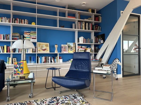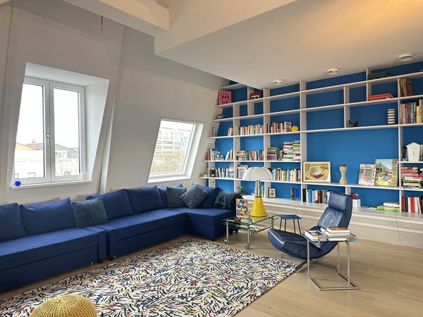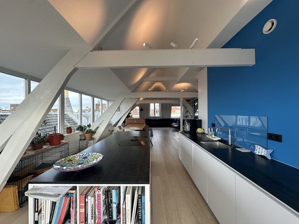 Karakteristiek shortstay-appartement op de 4e verdieping aan de Schiekade, Rotterdam. De leefruimte strekt zich open uit onder het indrukwekkende balkenplafond, met grote raampartijen waardoor het daglicht royaal binnenvalt. De woning is volledig gemeubileerd en beschikt over 1 slaapkamer.